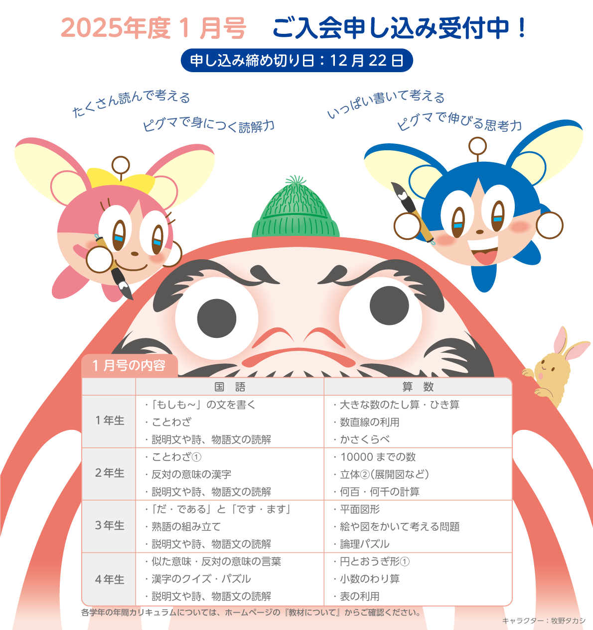 2025年度1月号入会申し込み受付中!&12月ピグマカレンダー 2025/11/21 ピグマカレンダー12月も公開中! プリンターの設定でB5判やA3判など、いろいろな大きさに印刷できます。 ぜひご利用ください。 (キャラクターデザイン)牧野タカシ